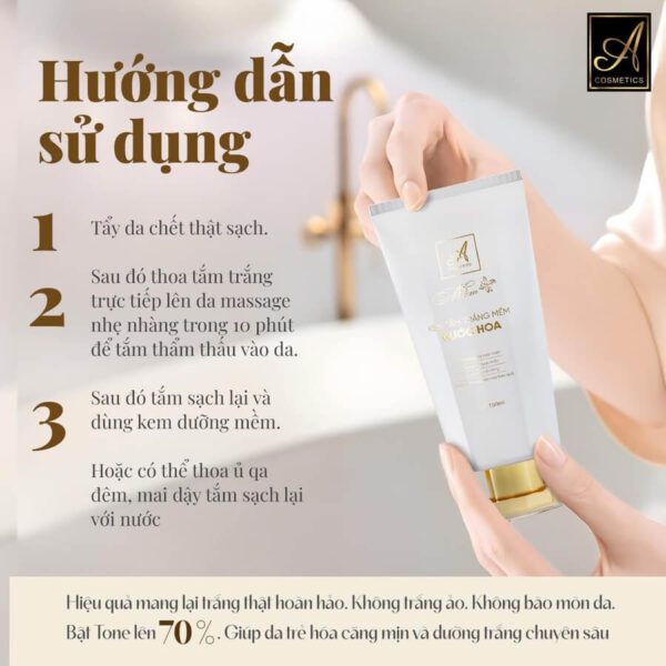 – Làm sạch cơ thể, thoa 1 lớp kem tắm trắng mềm A Cosmetics mỏng, đều lên vùng da cần dưỡng trắng.